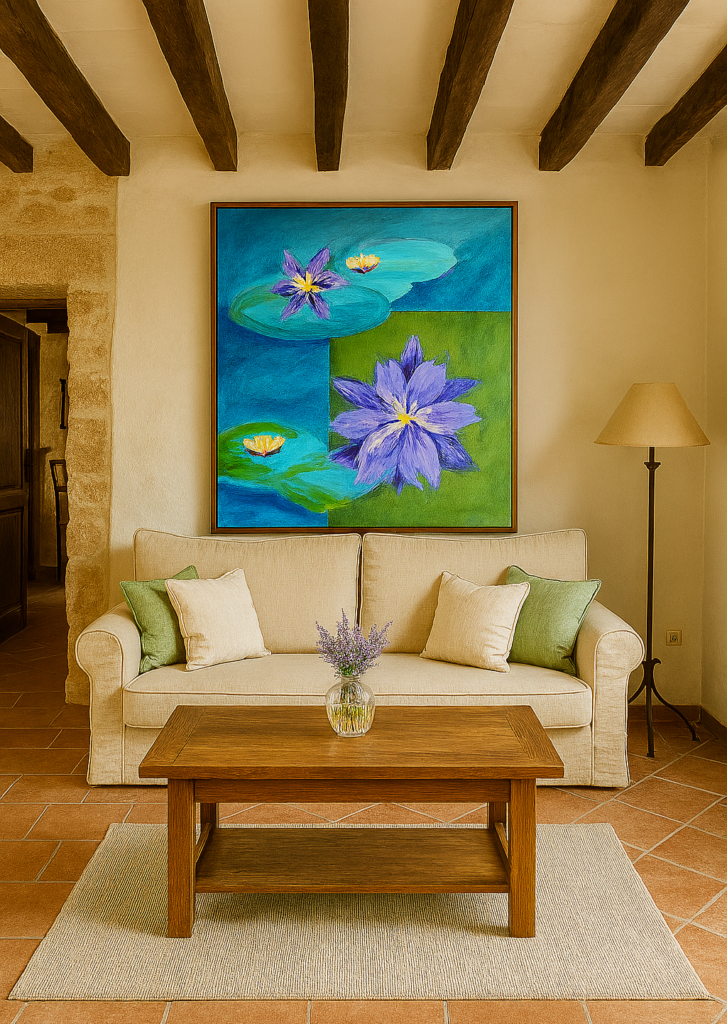 Esta obra está inspirada en los famosos nenúfares de Monet. El azul verdoso y las flores de color morados y blancos con destellos amarillos transmiten un ambiente de calma y quietud. Emana frescura, trata de representar ese instante previo al amanecer, esa serenidad y equilibrio natural.